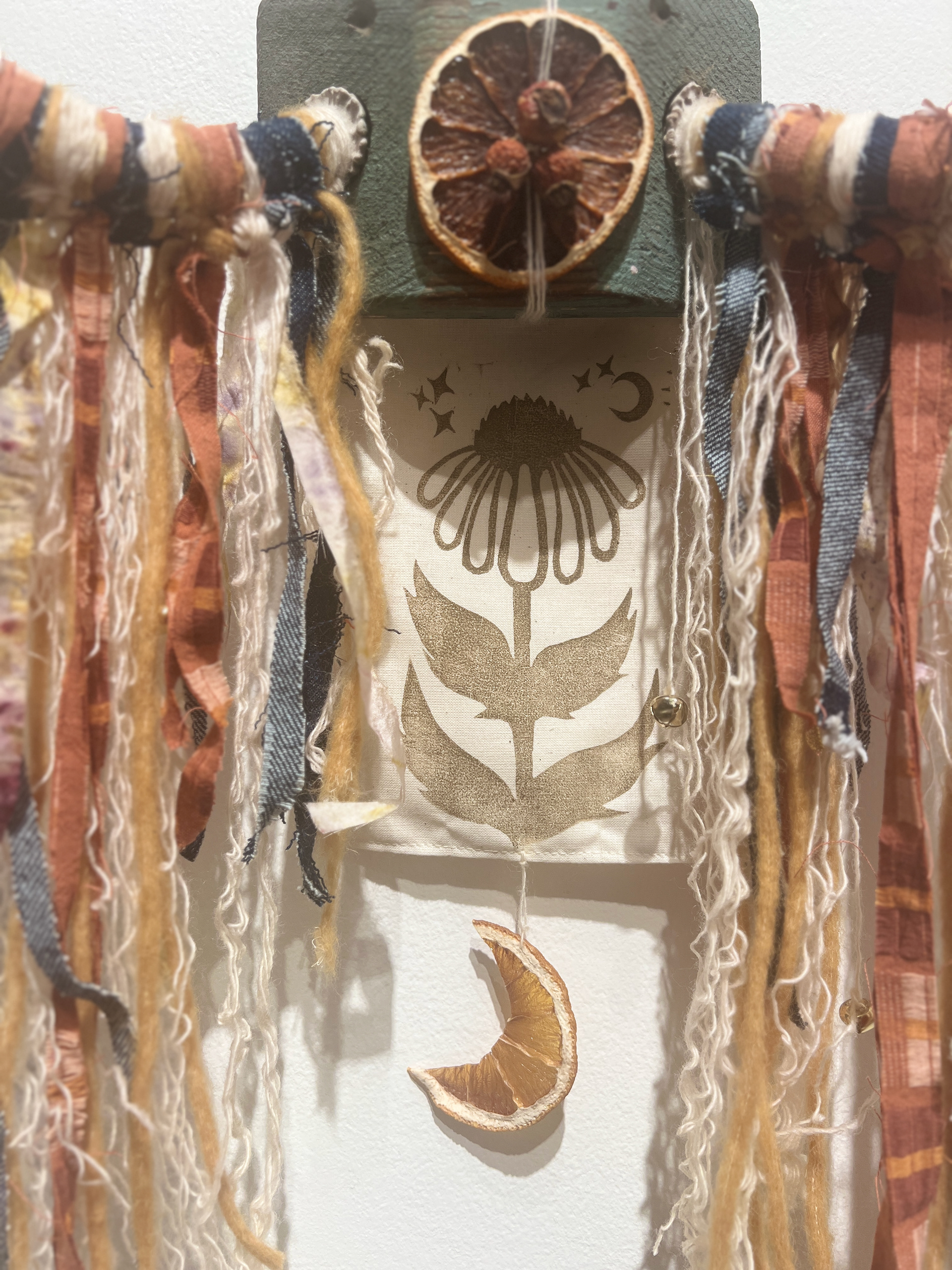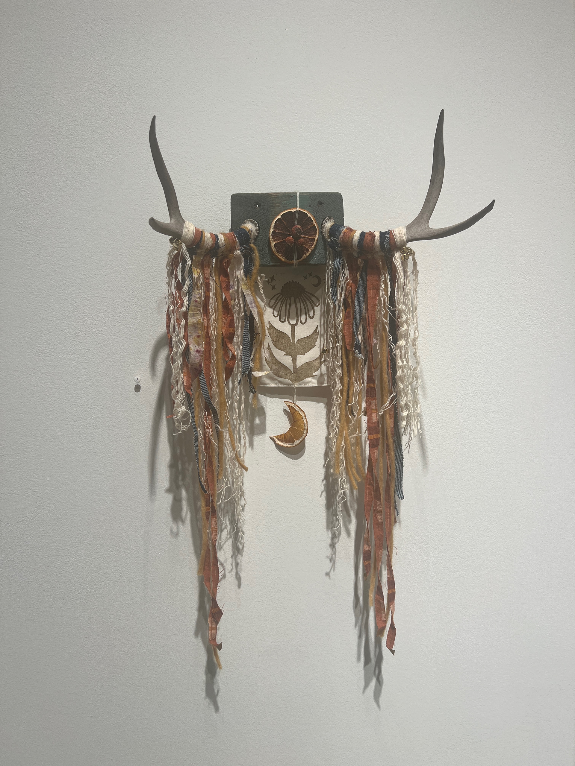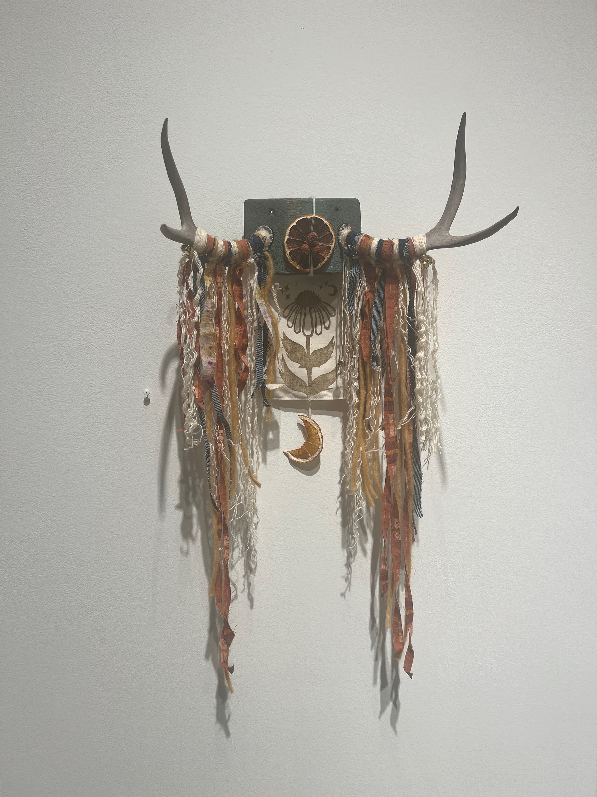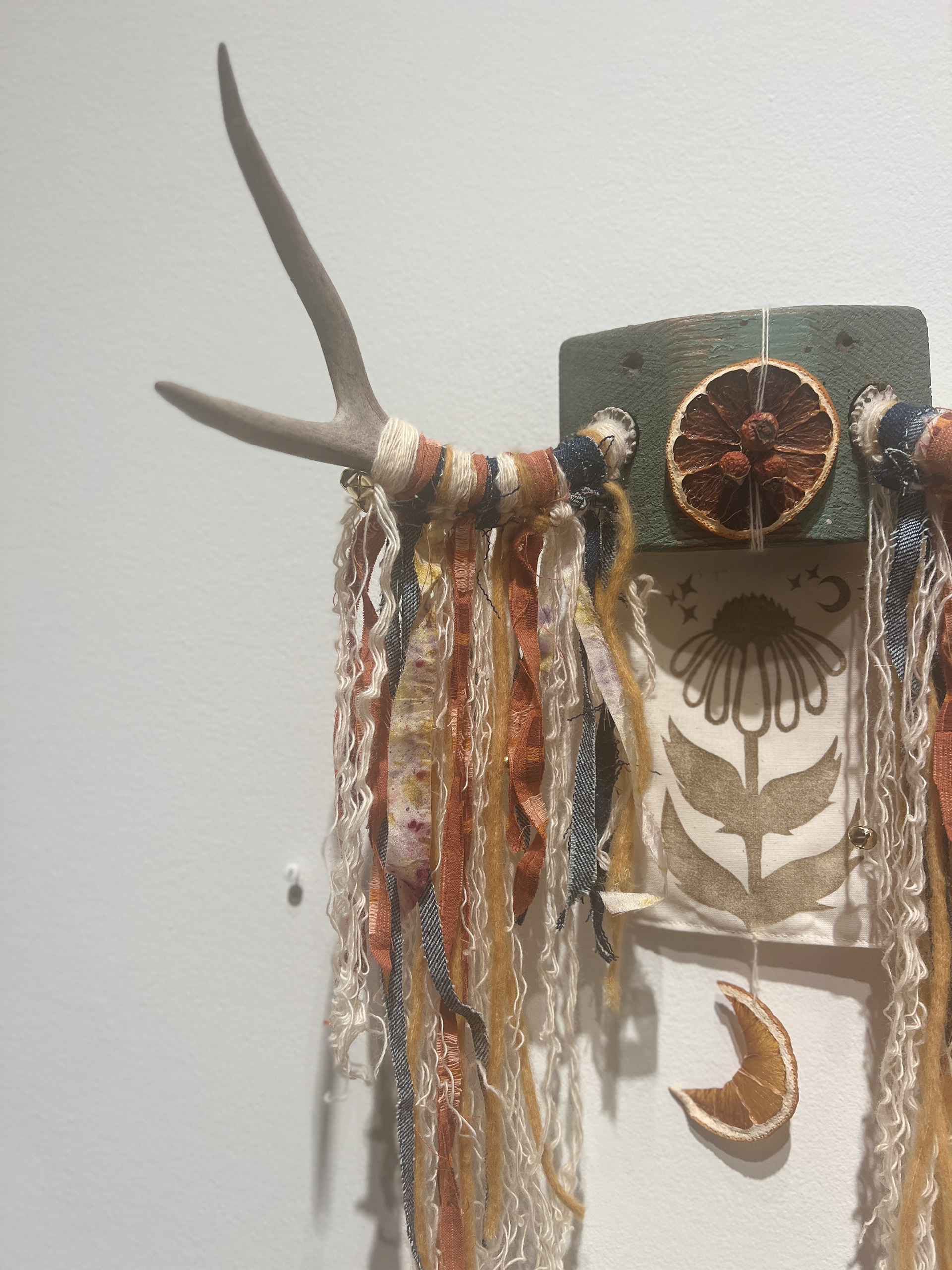 Someone, somewhere, in an unknown time away wanted to honor these in the way they were able to; the fact that the block was painted told me as much. Using natural materials and fibers, some of which were hand dyed by myself using botanicals, and recycled fabric scraps from previous projects, I wove a folk-like story of nature's adornment through collaboration of materials onto the antlers, bringing a new identity for the antlers into existence.